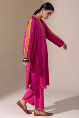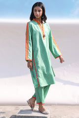 Jacquard-paneled classic-fit shirt with a low band neckline and V-slit, adorned with playful tassel detailing and enhanced with vibrant geometric jacquard borders. Paired with straight-fit trousers finished with border detail.