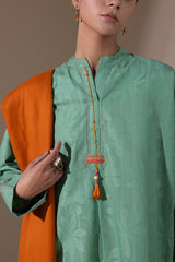 Jacquard classic-fit shirt with a low band neckline adorned with tassel detailing. Designed with subtle back pleat and fine stitching along the neckline, sleeve hems, and rounded shirt hem. Paired with a matching jacquard classic-fit shalwar.