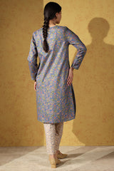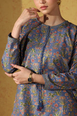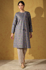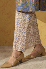 Gold-printed classic-fit shirt with a round neckline and V-slit, adorned with delicate embroidery and tassel detailing. Subtle embroidered accents finish the sleeve hems. Paired with a coordinated printed pegged shalwar.