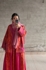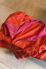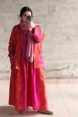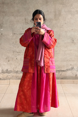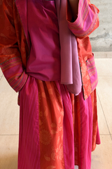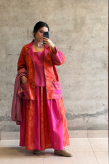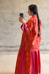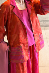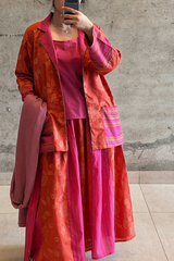Classic-fit jacquard jacket featuring front pockets, highlighted with geometric jacquard patterns on the pockets and sleeve borders. Subtle embroidered detailing enhances the sleeves and front opening. Styled with a contrasting spaghetti-strap inner shirt for a balanced silhouette, and paired with a flared jacquard paneled skirt.