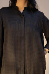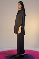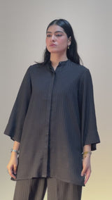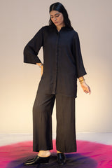 Classic-fit co-ord set featuring a button-down shirt with a band neckline, paired with matching culottes for a classic, chic look.