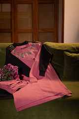 Softly-warm, embroidered long sweatshirt featuring a mock neckline adorned with vibrant embroidered details that add a burst of color and artistry. Finished with drop shoulders, ribbed sleeve hems, and a clean front seam for a sleek, modern finish. Paired with sweatpants for an easy, comfortable fit.