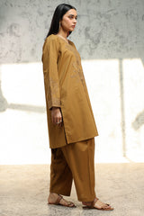 Classic-fit self-embroidered shirt with a V-neckline, featuring refined detailing along the neckline and sleeves. Paired with a classic-fit shalwar.