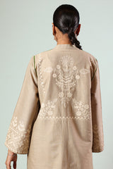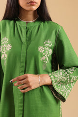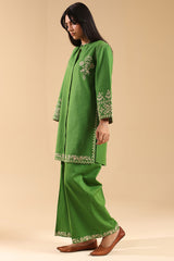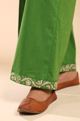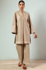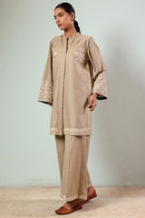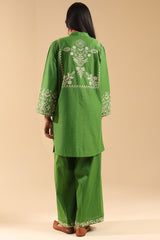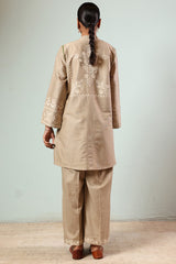 An embroidered classic-fit shirt with a low band neckline and front slit, featuring subtle drop shoulders. Paired with classic culottes, adorned with embroidered detailing along the ankle hemline.