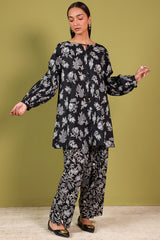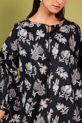 Classic-fit A-line printed shirt with a round neckline and V-slit adorned with tassel detailing. Finished with cuffed sleeves and paired with a classic-fit shalwar featuring slit detailing.