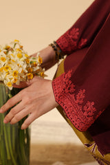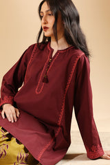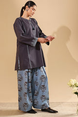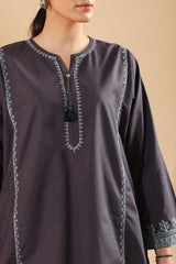 Embroidered paneled kurta with a round neckline and a V-slit, adorned with delicate tassel detailing. Paired with a classic printed farshi shalwar.
