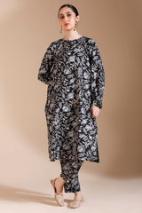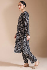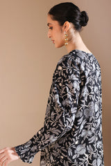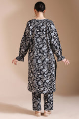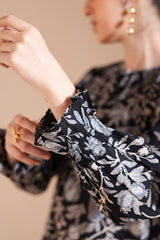 Classic-fit printed shirt with a keyhole neckline, adorned with delicate stitching detail. Gathers at the sleeve hems add a soft frill touch. Paired with matching printed straight-fit trousers featuring subtle stitching detail.