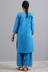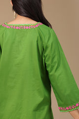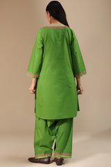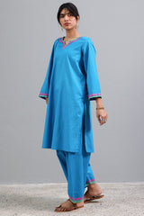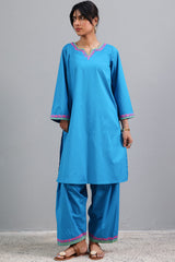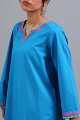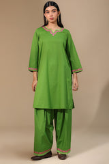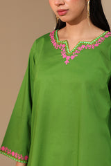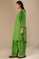 Classic-fit shirt with a round neckline and V-slit, adorned with delicate embroidery along the neckline and sleeve hems. Paired with a farshi shalwar featuring embroidered detailing at the ankle hemline.