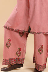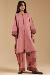 Hand block printed classic-fit textured shirt, finished with tassel detailing at the neckline for an artisanal touch. Paired with a hand block printed farshi shalwar.