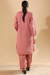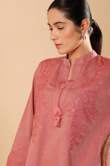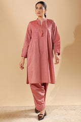Embroidered textured paneled shirt with a low band neckline and tassel detailing along the V-slit. Paired with a textured classic-fit shalwar for a refined, coordinated look.