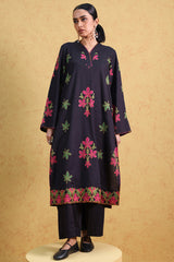 Embroidered classic-fit shirt with an overlap placket, adorned with delicate stitching along the neckline, sleeve hems, and side slits. Paired with classic-fit culottes for a refined, coordinated look.