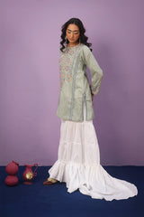 Farshi, flared and tiered one size gharara with gather details, designed to provide a light, breezy feel perfect for Eid.