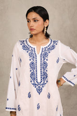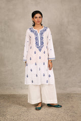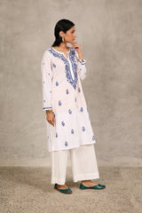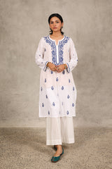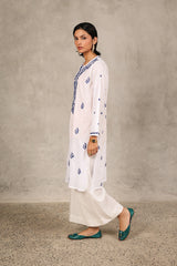 A handcrafted classic-fit kurta featuring a round neckline with a V-slit. The neckline and placket are adorned with delicate hand-detailed embellishments. Subtle motifs grace the fabric, while intricate detailing enhances the sleeve hems. Can be paired with any Generation fit for a refined look.
