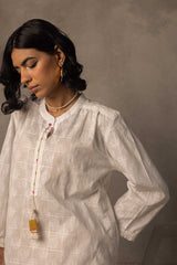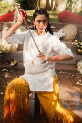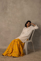A classic-fit kurta features a round band neckline and a front placket adorned with vibrant tassels and button details. Delicate cutwork at the back is highlighted with colorful stitch accents. The sleeve hems are finished with frill lace, adding a soft, feminine touch. Paired with a wide-flared, colorfully embroidered gharara, it blends tradition with effortless charm.
