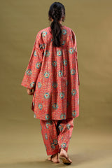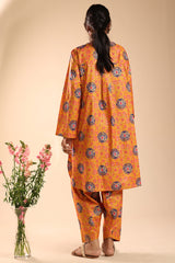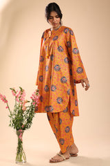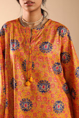 Gold printed classic-fit shirt with a round neckline and V-slit, adorned with delicate tassel detailing. Featuring subtle pleat detailing at the back. Paired with matching printed classic-fit shalwar.