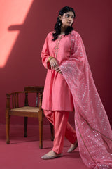 Embroidered classic-fit paneled shirt with delicate embroidery on the neckline and sleeve hems, enhanced with subtle bead embellishment and finished with lace detailing. Paired with a classic pegged shalwar with button detailing along the side slit, and completed with a lurex organza dupatta finished with lace detailing.