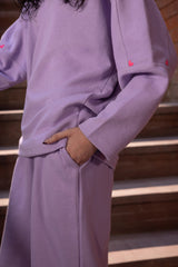 Snug, relaxed-fit V-neck sweatshirt designed with drop shoulders, wide sleeves, and an embroidered heart on the arm for a sweet, minimal touch. Paired with soft sweatpants for a comfortable, laid-back look.