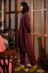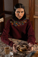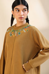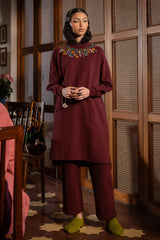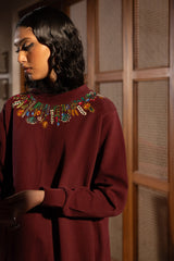 Softly-warm, embroidered long sweatshirt featuring a mock neckline adorned with vibrant embroidered details that add a burst of color and artistry. Finished with drop shoulders, ribbed sleeve hems, and a clean front seam for a sleek, modern finish. Paired with sweatpants for an easy, comfortable fit.