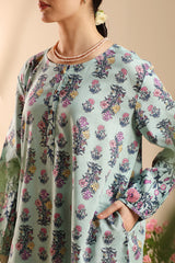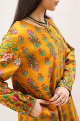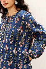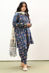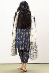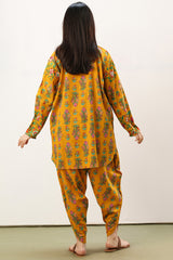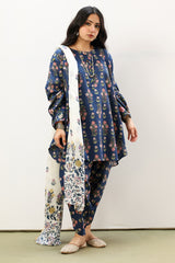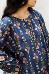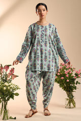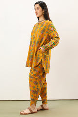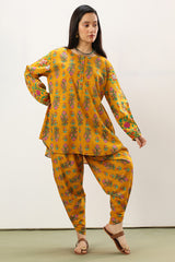 Classic-fit printed shirt with a round neckline and buttoned front placket. Designed with subtly relaxed shoulders, cuffed sleeve hems, side pockets, and a rounded hem. Paired with a matching printed tulip shalwar.