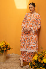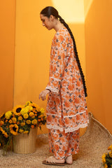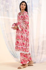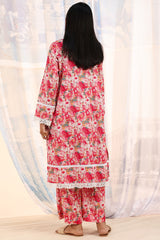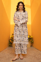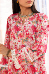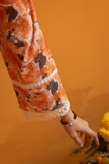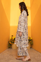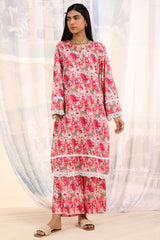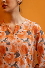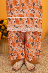 Printed classic-fit shirt with a round neckline and V-slit, adorned with delicate embellishments. Lace detailing accents the sleeves and shirt borders, while subtle drop shoulders create an relaxed silhouette. Paired with matching printed culottes.