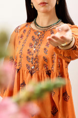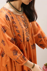 Printed gathered dress with a round neckline and buttons along the front placket. Designed with cinched sleeve hems and drop shoulders. Gathers at the empire waist create a softly flared silhouette. Paired with coordinated printed straight-fit trousers.