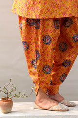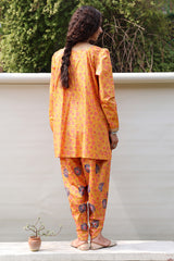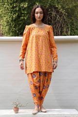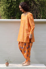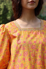 Gold printed classic-fit shirt with a square neckline, adorned with delicate embroidered detailing along the neckline and puffed sleeve hems. Paired with coordinated printed pegged shalwar.