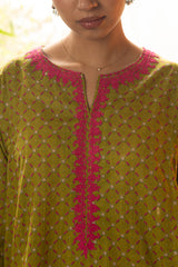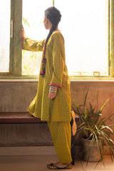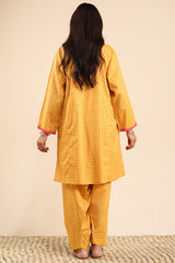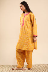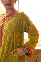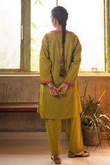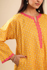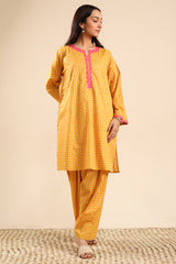Printed classic-fit kurta with a round neckline and V-slit, adorned with delicate embroidered detailing along the neckline and sleeve hems. Designed with side pockets for added comfort. Paired with a matching printed classic-fit shalwar.