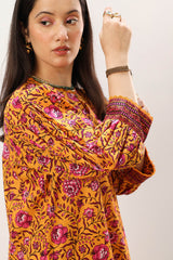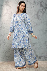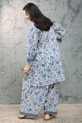 Relaxed-fit printed shirt with a keyhole neckline, accented with button detailing and scalloped lace along the neckline and sleeve hems. Paired with a matching printed farshi shalwar.