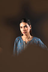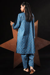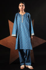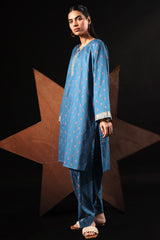 Gold-printed classic-fit shirt with a round neckline and V-slit, detailed with coordinating gold-printed borders along the placket and sleeve hems. Styled with a matching printed classic-fit shalwar.