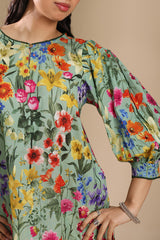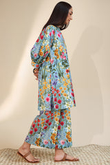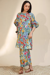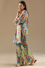 Soft floral printed classic-fit shirt with a keyhole neckline, finished with delicate lace detailing along the neckline and cuffed sleeve hems. Paired with matching printed culottes.