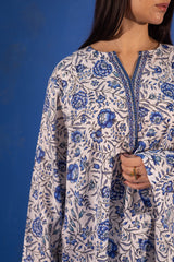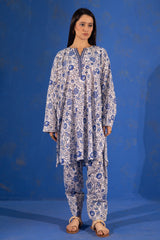 Printed classic-fit shirt with a round neckline and V-slit, finished with a softly rounded hem. Paired with a matching printed pegged shalwar, detailed with stitching along the borders.