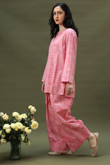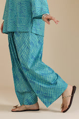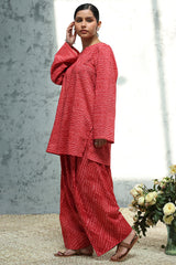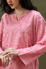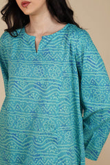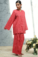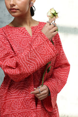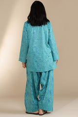 Chunari-printed paneled shirt featuring a round neckline with a V-slit. Paired with a coordinated printed farshi shalwar.