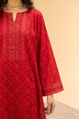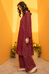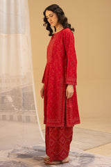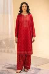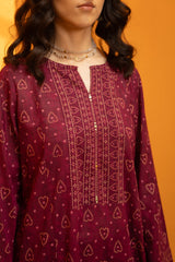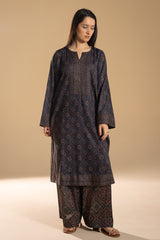 Chunari printed classic-fit paneled shirt with a round neckline and V-slit, adorned with delicate mukaish detailing along the front slit. Paired with a coordinated printed farshi shalwar.