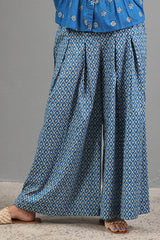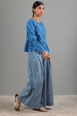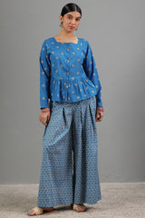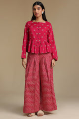 Classic-fit printed peplum top with a square neckline and button detailing along the front placket. Gathers add a soft flare to the silhouette. Paired with coordinated printed flared pleated trousers.