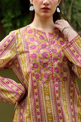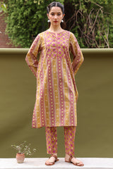 Classic-fit printed shirt with a round neckline accented with mukaish detailing along the front slit. Paired with matching printed straight-fit trousers.