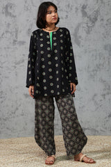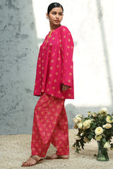 Relaxed-fit printed paneled kurta with a round neckline and color-block placket. Subtle drop shoulders and side pockets add functional ease. Paired with a coordinated printed classic-fit shalwar.