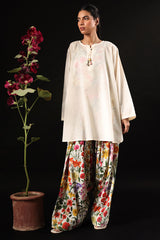 Relaxed-fit shirt with a round neckline and V-slit, adorned with tassel detailing. Designed with subtle drop shoulders, a rounded hem, and delicate pleats at the back for a flowing silhouette. Comes with a printed inner for added style. Paired with a coordinated printed farshi shalwar finished with stitching detail along the borders.