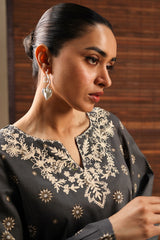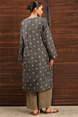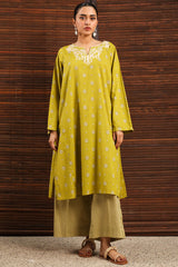 Printed paneled classic-fit shirt with a round neckline and V-slit, adorned with delicate embroidered detailing. Paired with coordinated printed culottes.