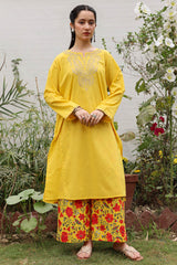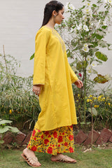 Paneled shirt adorned with delicate embroidered accents along the bodice and sleeve hems. Paired with floral printed culottes.