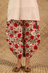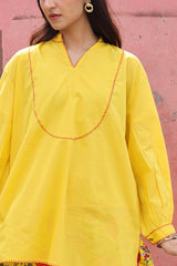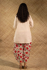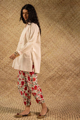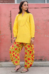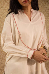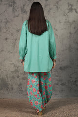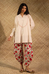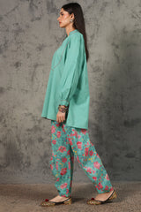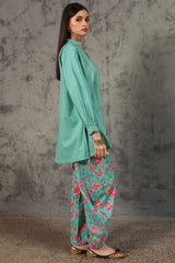 Classic-fit shirt with a low band neckline, enhanced with delicate stitching detail along the neckline, side slit, hemline and cuffed sleeve hems. Thoughtfully designed for a refined silhouette and paired with a coordinated printed balloon shalwar.