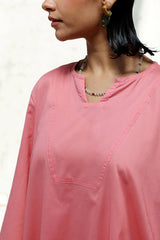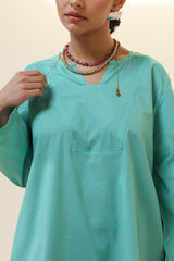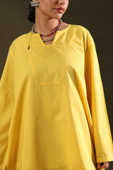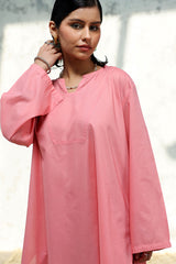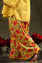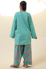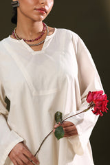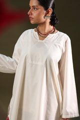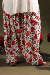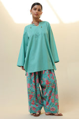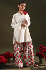 Relaxed-fit shirt featuring subtle drop shoulders and a rounded hem for a softly structured silhouette. Paired with a vibrant floral-printed farshi shalwar.