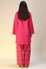 Classic-fit shirt with a round neckline and V-slit, adorned with printed border detailing along the neckline and sleeve hems. Paired with a coordinated printed farshi shalwar.