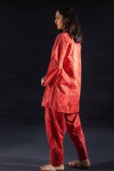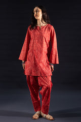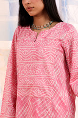 Soft chunari-printed, classic-fit paneled shirt accented with delicate mukaish embellishment on the bodice. Paired with a coordinated printed pegged shalwar, refined with subtle stitching along the borders.