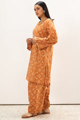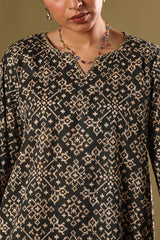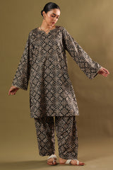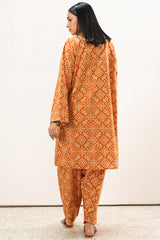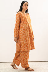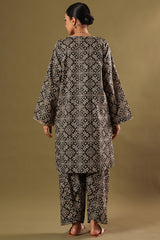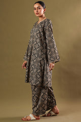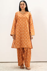 Classic-fit printed shirt designed with subtle embroidered accents at the neckline and sleeve hems. Styled with matching printed khula poncha shalwar.