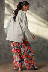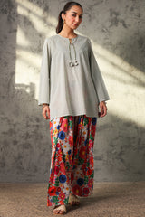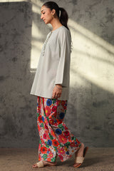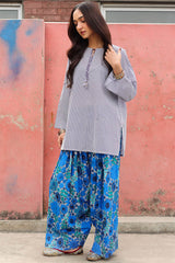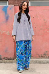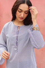 Classic-fit printed shirt with a round neckline and V-slit, adorned with tassel detailing. Paired with a coordinated printed farshi shalwar.