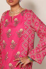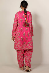 Paneled printed shirt designed with a round neckline and subtle V-slit. Paired with a coordinated printed khula poncha shalwar.
