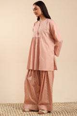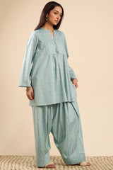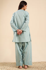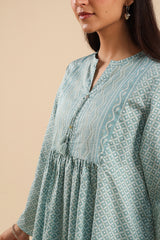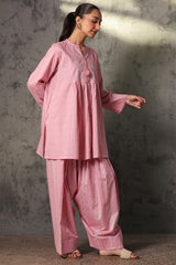 Classic fit gathered shirt with a round neckline, adorned with tassel detailing along the v-slit. Gathers around the empire waist create a flowy silhouette. Paired with a coordinated printed farshi shalwar.