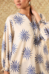 Classic-fit printed shirt with a round neckline and V-slit, adorned with button detailing along the front slit. Featuring smocked sleeve hems and a rounded hemline. Paired with coordinated printed culottes.