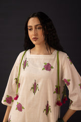 Hand block-printed classic-fit shirt with a square neckline, adorned with delicate gota lace detailing along the edges. Finished with playful tassel detailing on the shoulders. Paired with coordinated culottes.