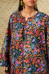 Printed classic-fit shirt adorned with playful tassel detailing along the V-slit. Paired with a coordinated printed farshi shalwar.